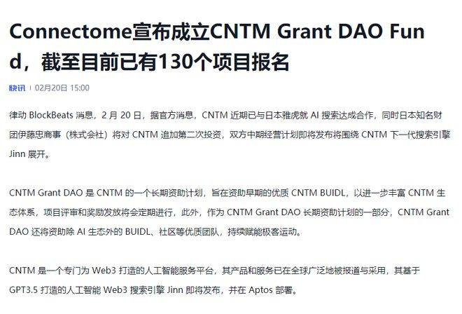 随着OpenAI的爆火,全球各大科技巨头都开始全力布局AI赛道,其中包括雅虎。在与Line合并之后,日本雅虎每年将投入超过1000亿日元用于人工智能技术的投资与开发,致力于成为全球领先的AI公司。日本雅虎与CNTM正式达成了合作,在AI智能搜索方面进行全面的业务合作,雅虎也将为CNTM提供相应的资源与资金支持,致力于共同打造全球第一的AI Web3搜索引擎。