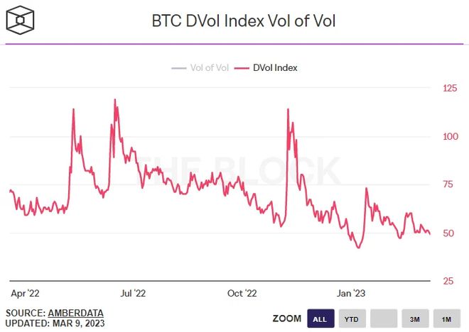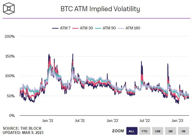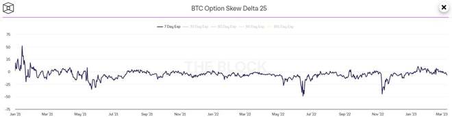 虽然 30 天和 60 天到期的期权的 25% delta 偏差也分别降至 -3 和 -2 左右的年内最低水平,但 90 天和 180 天到期的期权的 25% delta 偏差已经下跌一直坚持下去,两者都接近于零。 这表明投资者认为,当前市场面临的逆风(加密货币银行下跌、美国监管机构加强审查以及美联储继续采取紧缩措施)不太可能使比特币从当前水平持续走低。