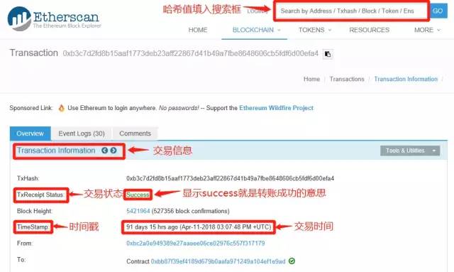 如果是交易所转账,交易所也会提供一个哈希值,不过每个交易所的名称不一样,如果要查询的话,可以联系交易所客服,让他们提供一下,当你获得一个哈希值的时候,可以输入到 https://etherscan.io搜索框,会出现这样一个页面,只要交易状态显示成功,即表示转账成功。