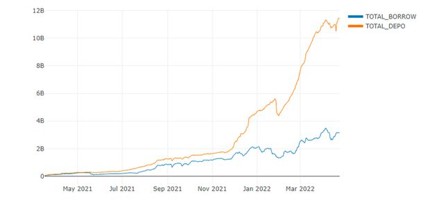 结果就是Anchor的存款规模快速上升,贷款规模虽然也在上升,但是远远不及存款的上升速度。