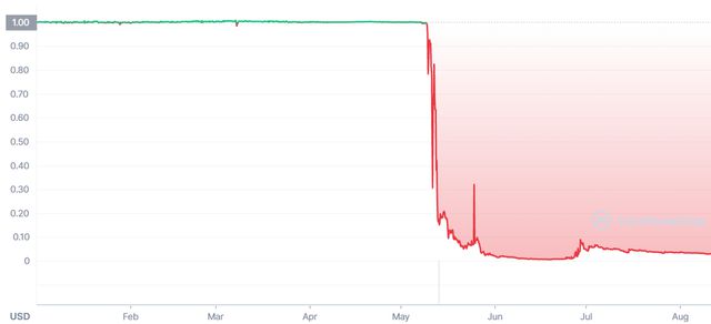 但是随着UST价格越来越低,最终引发恐慌,虽然官方号称拿出30亿美元护盘,但是相比于180亿的UST总量来说只是杯水车薪,UST不到一周时间就跌到了0.2美元,最低跌到了0.006美元左右。