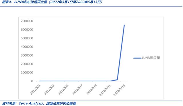 因为尽管UST的市场价格已经低于1美元,但是在系统中还是可以按照1美元的价格兑换LUNA,这样就有了利润空间,所以就有大量的人来销毁UST,兑换LUNA并抛售,结果就是LUNA大量增发,总量从7亿很快膨胀到了几万亿,LUNA价格从85美元跌到不足1美元,只用了6天时间。