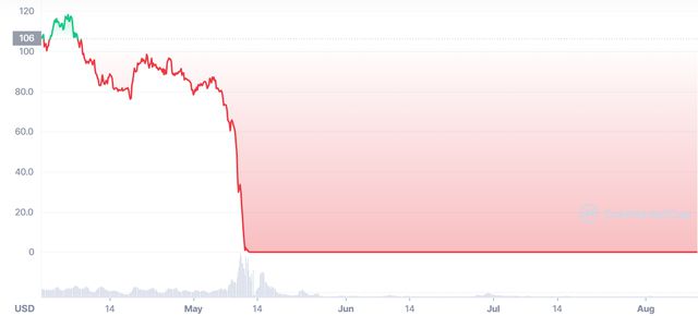 然而就是这样一个项目,却在不到一周的时间内灰飞烟灭,LUNA价格从近90美元跌到0.00005美元,只剩不到百万分之一,无数人倾家荡产。