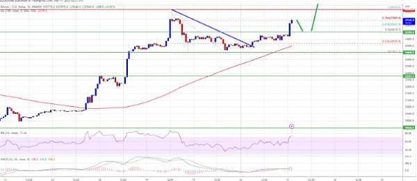 此外,在 BTC/USD 货币对的小时图上突破了主要看跌趋势线,阻力位在 24,450 美元附近。比特币价格目前交易价格高于 25,000 美元和 100 小时简单移动平均线。