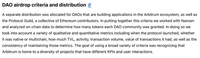 据Arbitrum 官方推文,对生态中DAO 组织空投的核心原则是能真正支持Arbitrum 的子社区,并且只有Arbitrum 上具有DAO 组织结构及社区金库的项目,才有资格参与本轮分发: