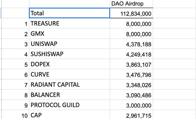 其中,链游开发团队Treasure DAO、Arbitrum 原生去中心化交易所GMX 都将获得800 万枚$ARB 并列第一。以太坊DEX Uniswap 和SuShiSwap 则将获得约430 万枚空投,名列第三、四名。