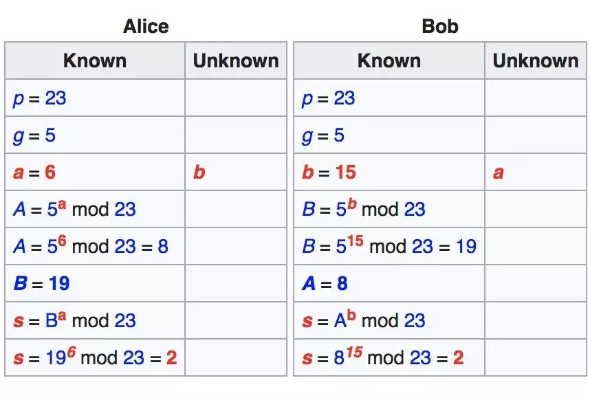 这样双方就知道密钥为 g^(xy) mod n=(g^y mod n)^x mod n=(g^x mod n)^y mod n。