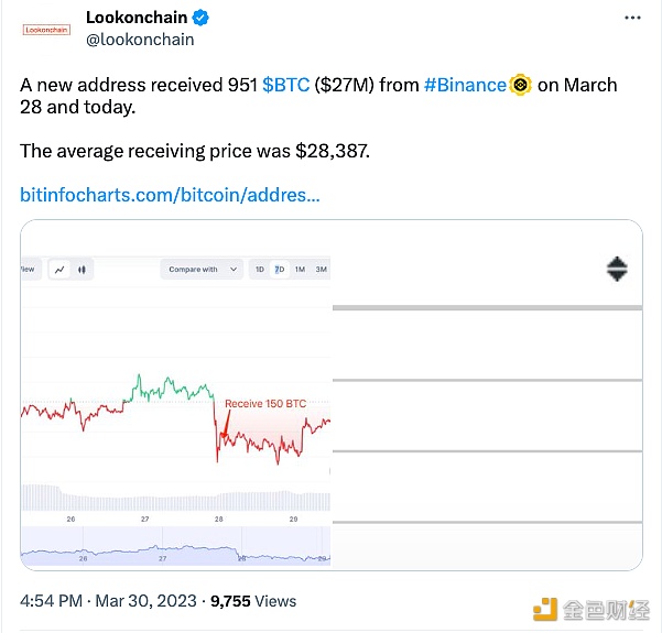LoGate.ioonchain监测显示,一个新地址在3月28日和今天从Binance收到951枚BTC(价值约2700万美元)。平均接收价格为28,387美元。