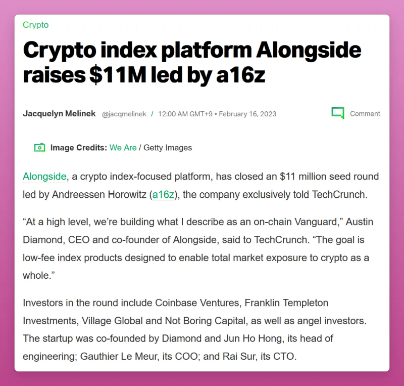 上周,Alongside 指数协议宣布由 A16z 牵头、Coinbase 加入的 1100 万美元种子融资。