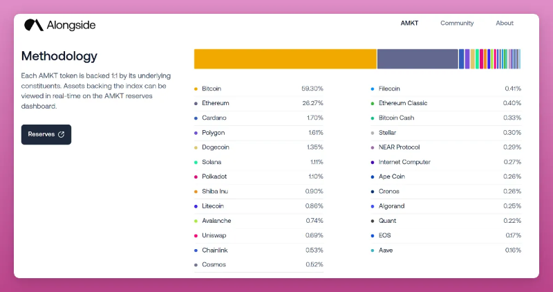 Alongside Crypto Market Index($AMKT)是一个中心化解决方案,其中包括一篮 25 个由市值加权的资产,以及资产由 Coinbase 托管。