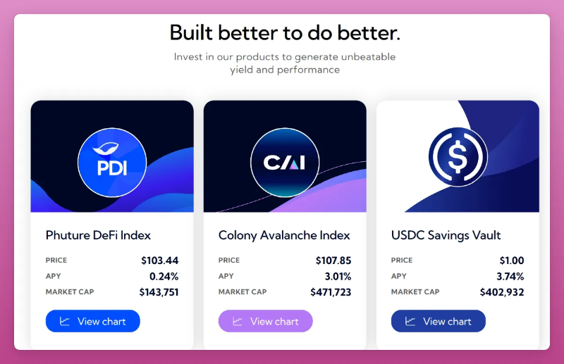 Phuture DeFi 指数(PDI)。 Colony Avalanche Index (CAI) - 跟踪 Avax 生态系统(JOE, sAVAX, AVAX 和 QI)。 USDC Savings Vault (USV) - 通过管理 3-6 个月的债券组合产生利息。USV 由 Notional(一种用于固定利率借贷的 DeFi 协议)驱动。