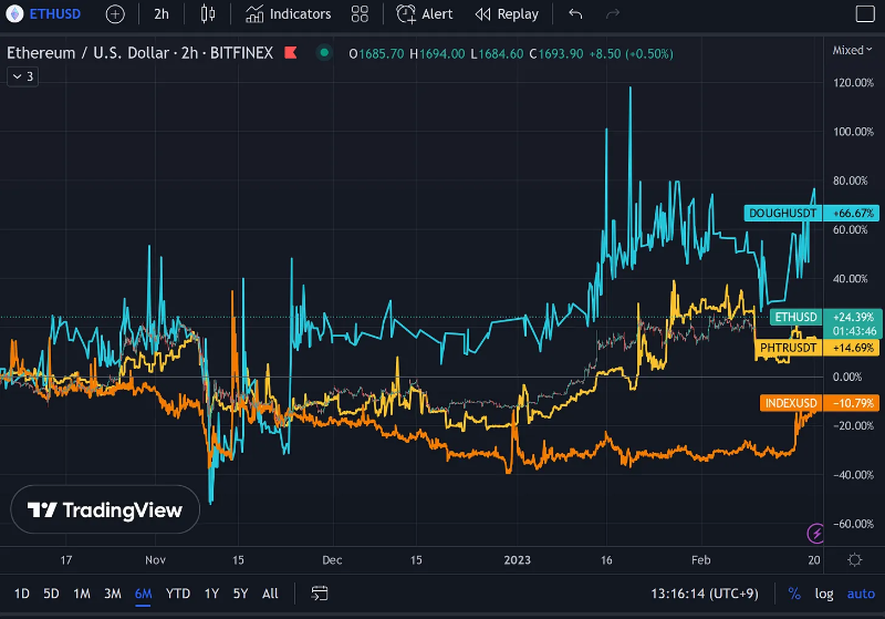除了 DOUGH(PieDAO)之外,指数治理代币的表现均未能超过 ETH。