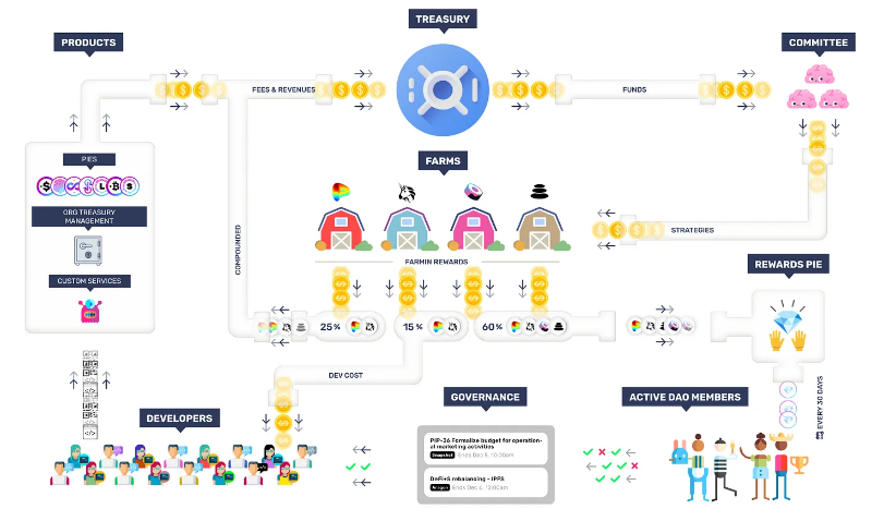 PieDAO 将其 60%的收入按比例重新分配给活跃的社区成员,即他们持有的 veDOUGH 数量。