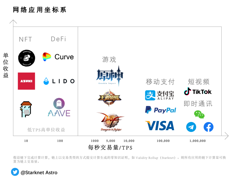 但在一个 TPS 更高,Gas 更低的网络上,允许有更低单位收益(每次交易的收益很低,因此容忍高Gas)和更高 TPS 要求的应用——或称之为链上复杂应用涌现出来。我们可以建立一个坐标系,横轴是 TPS,纵轴是单位收益,将许多应用排上去,我们将会知道在不同的 TPS/单位收益等级都有哪些应用,进而可以大致推理出有哪些应用将在更高性能表现的网络上诞生。
