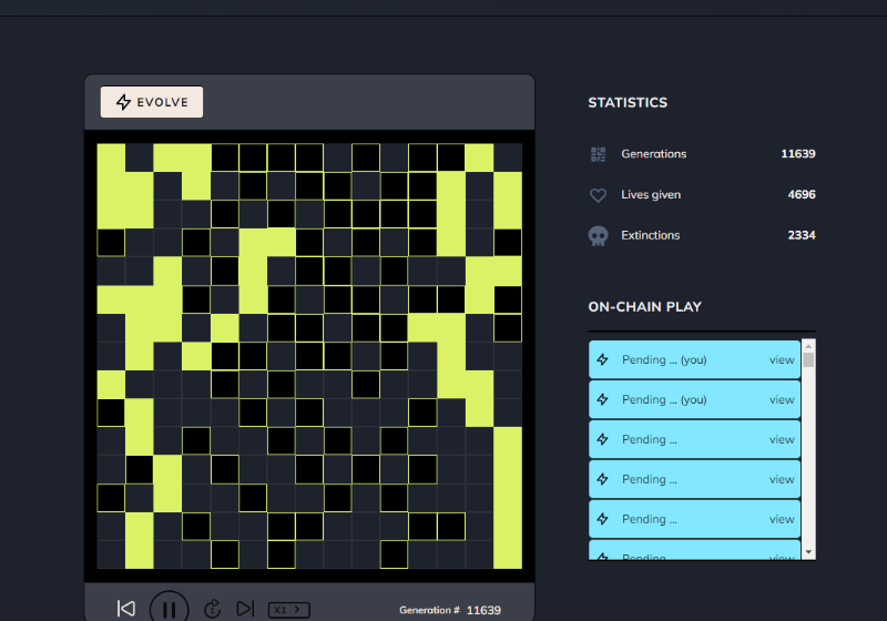 GoL2 仍然参考传统生命游戏的基本规则,玩家在网格上创建一个初始配置,然后细胞将根据游戏规则进化(生或死),形成多种组合。玩家可以通过 GOL2 的代币来恢复选定的细胞或创建新的游戏。