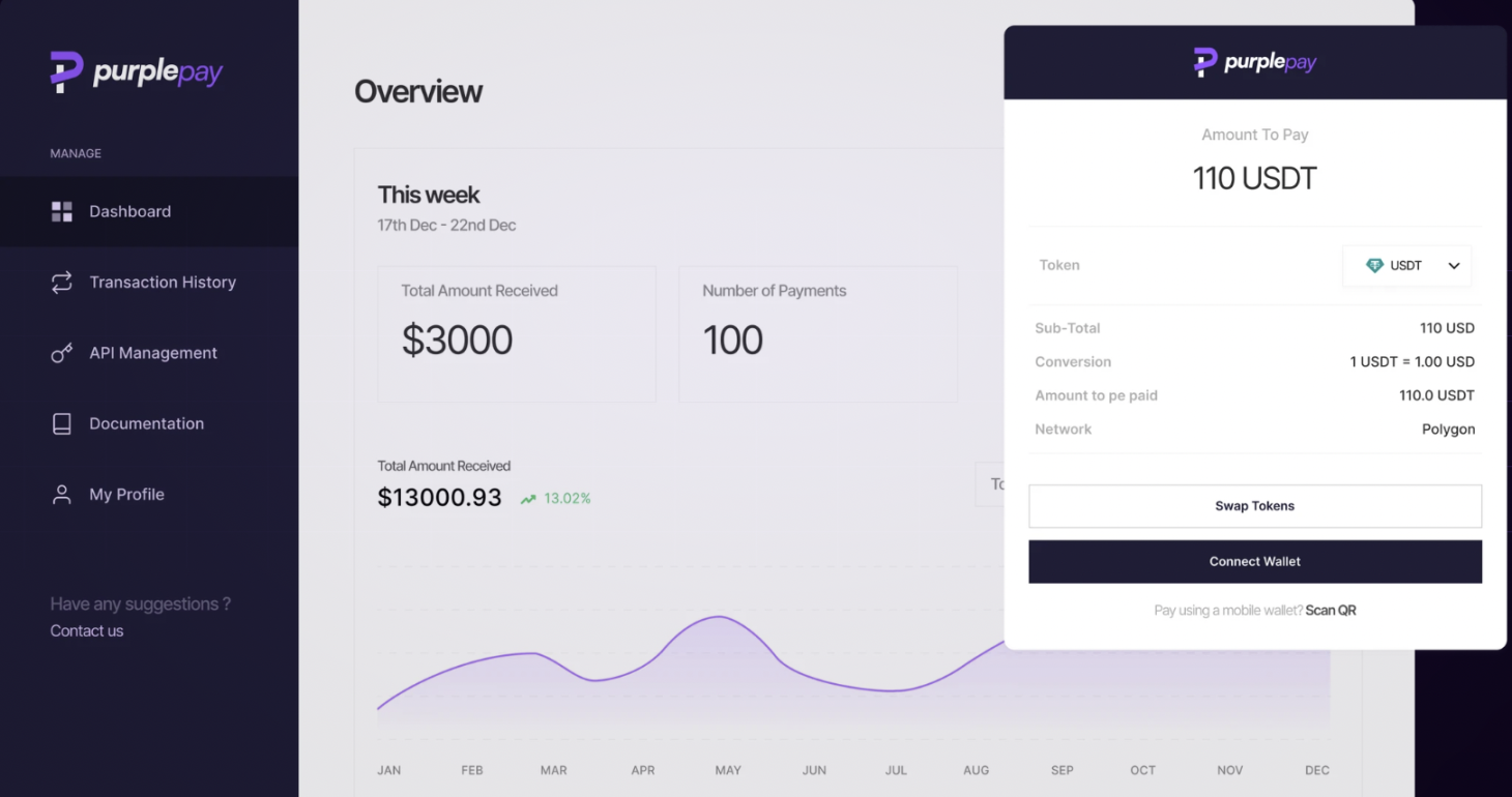 Purple Pay是一个加密支付基础设施,旨在让企业可一键接受加密支付,Purple Pay 的官方网站表示其结算速度快,时间不到 60 秒,成本仅为传统网关的一半。Purple Pay 的「Transaction History」页面可管理付款并且查看报告,使用者无需花时间评估区块浏览器。Purple Pay 称每笔交易都可在用户自己的自托管钱包中接收资金。Purple Pay 使用 Transak 进行出入金,使用 Biconomy 来支持无 Gas 交易。