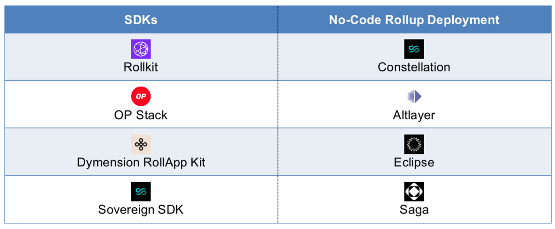 大多数 RaaS 项目都使用这些 SDK 来开发易于使用、无需代码的 Rollup部署解决方案。Rollups as a Service(RaaS)的市场一直在迅速增长,多种 SDK 已经出现以满足开发者的需求。这些 SDK 提供了各种功能和选项,以简化部署 Rollup 的过程,包括对执行和结算的完全控制,对网络的标准化为不同的层,与各种虚拟机的兼容性以及简化 zk-Rollups 的创建。