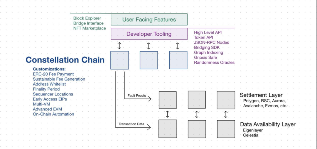 Constellation 让开发者可以使用 OP Stack 轻松部署 Rollup。这些 Rollup与OP EVM 兼容 Rollup兼容,并针对快速性能进行了优化。每个“Constellation 链”都包括区块浏览器和桥接,可以通过块时间和帐户权限等选项进行自定义。