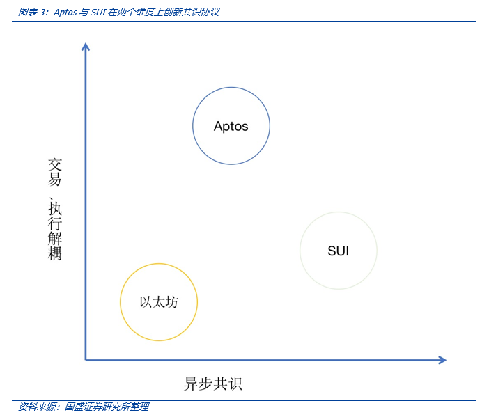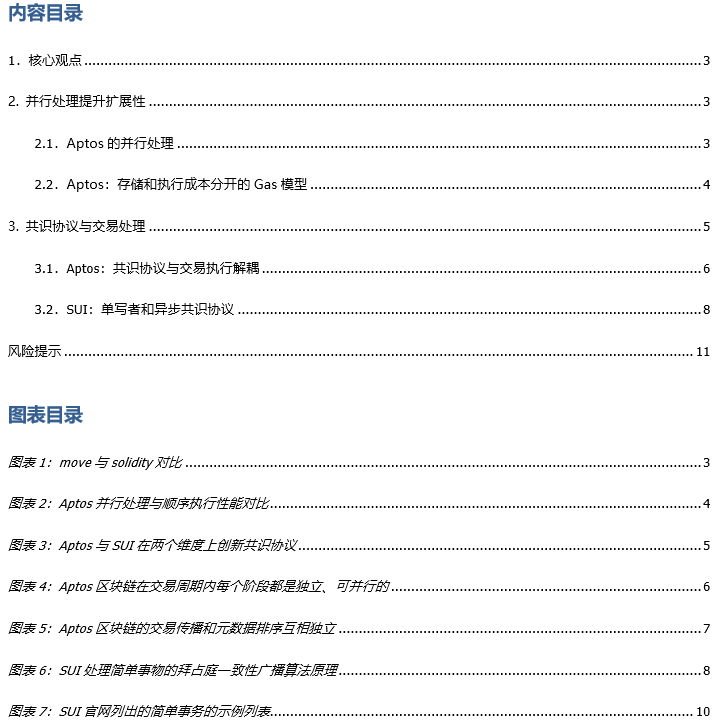 3共识协议与交易处理我们所熟悉的区块链如以太坊,通常作为一个去中心化的状态共享机器,随着时间的推移,系统用户状态以区块的方式累加——即绝对的串行交易排序。我们在本系列的前两篇报告层对Move语言并行处理进行过分析,以Aptos、SUI为代表的Move系基础链都有各自的并行处理模式,这依赖新的共识协议——由于Move语言的特点,Aptos的共识协议与交易执行解耦的模式,以及SUI的单一编写者和异步共识协议都为区块链交易的共识提供了更多的灵活性——前者将交易执行流程细分进行独立、批量处理,而后者则充分考虑到验证节点的算力负担,试图将一些简单交易从验证节点解放出来。