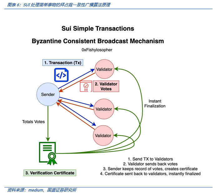 链上存在着很多简单交易需求,如用户只是想将资产发送给收件人,这种简单交易通常只与发件人相关。如我们前两篇报告所述,Move的资产是一种资源类型,SUI区分了两种类型的资产: i)只能由其特定所有者修改的资产,如发送资产给收件人;ii)没有特定所有者而是由多个用户修改的共享对象资源——这类资源的操作流程比较复杂。很显然第一类是非常简单的交易类型,这种区别使得SUI可以通过对第一类简单事务简化共识来实现非常低的延迟的设计。