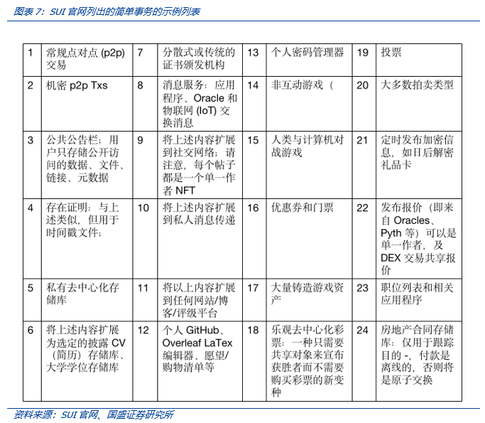 为识别简单事物交易,SUI使用基于拜占庭一致性广播算法(Byzantine Consistent Broadcast)。这种简单算法是的SUI在处理非关联的简单交易时,只对相关数据而不是整个链进行锁定(或“停止区块链世界”,如以太坊出块延迟那样),或者简单理解为对这类非关联简单交易事务脱离交易排序进行特别处理——即识别单一作者应用程序( Sui Single-Writer-Friendly (SWF) Apps),官方文档列有24类简单事务的示例列表(如简单的P2P2交易、公共信息公告),这些单一作者事务可以使用该算法进简单快速处理。