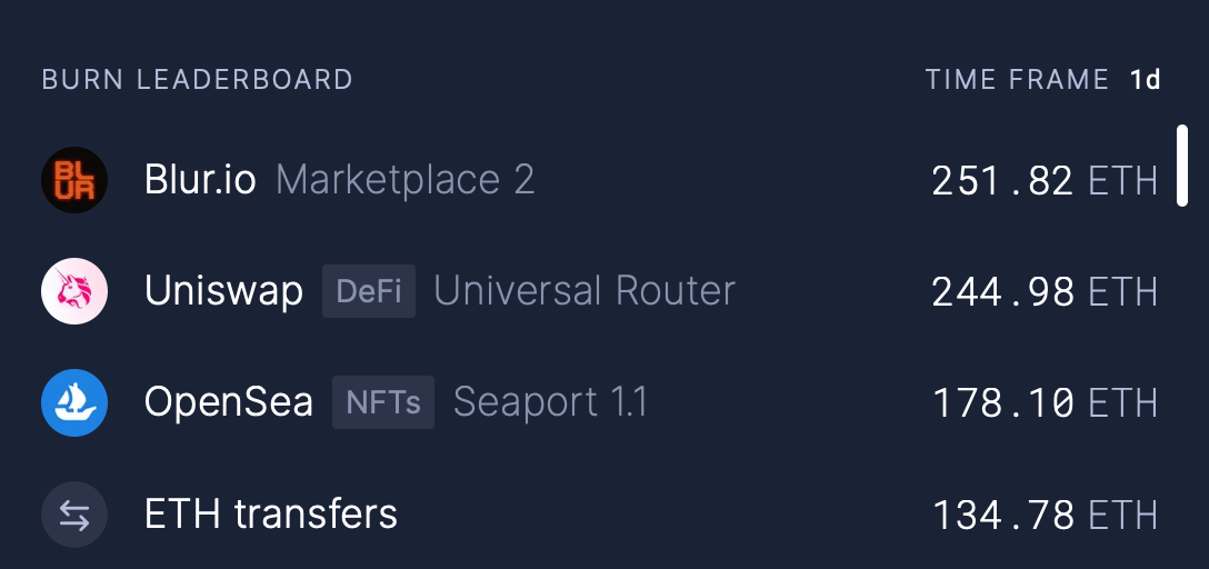 2月19日消息,据ultrasound.money数据显示,Blur过去24小时燃烧的ETH数量排名第一,燃烧了超251枚ETH,Uniswap燃烧的ETH数量排名第二,OpenSea排名第三。