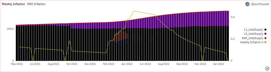 据Dune 数据显示,撰写本文时,SNX 总量为约 3.14 亿,L1 与 L2 总计的质押率约为 67.37%,而在 Curve 上提供流动性并可以进行原子交换的 sUSD、sETH、sBTC(包括 L1 和 L2)分别约有 3690 万枚、19180 枚、576.7 枚,按照撰写本文时的 SNX 以及比特币、以太坊价格计算,这些提供流动性的 sTGate.ion 总价值约为 8340.48 万美元,质押的 SNX 总价值约为 5.589 亿美元,可用于原子交换的 sTGate.ion 总价值不到质押 SNX 总价值的 15%。