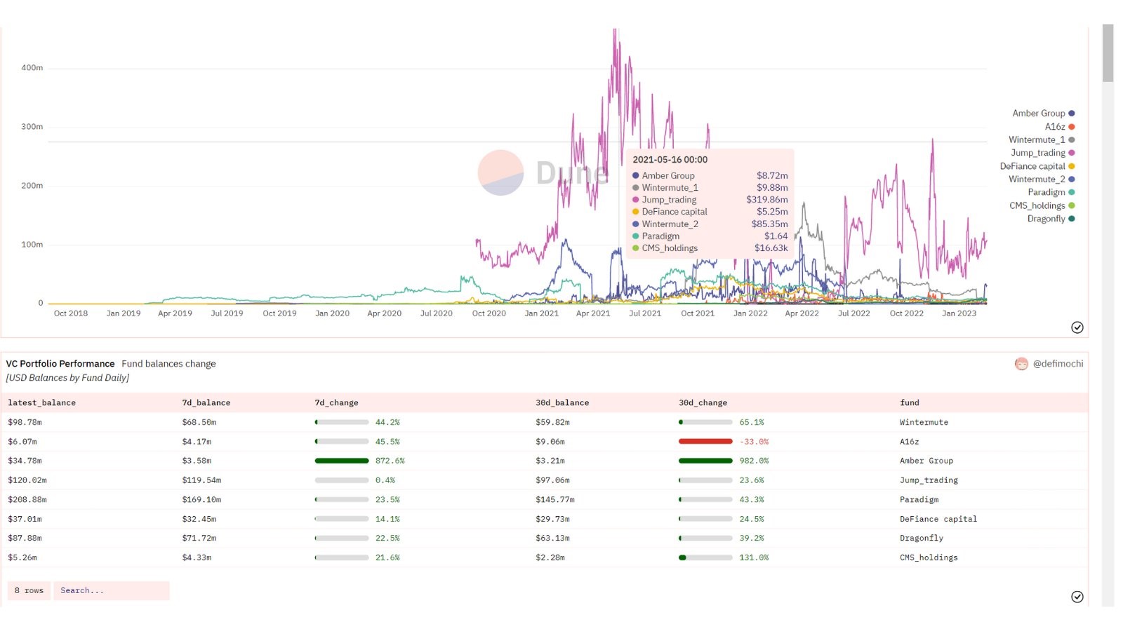 事实上,在普通加密散户投资者尝试入场的时候,一些头部风险投资公司早就未雨绸缪提前布局,并且获得了丰厚的回报。通过追踪头部VC的钱包,链上数据分析师@Defi_Mochi重点分析了a16z、Dragonfly、以及Amber Group这些机构投资者在最近加密货币市场反弹过程中的具体收益。