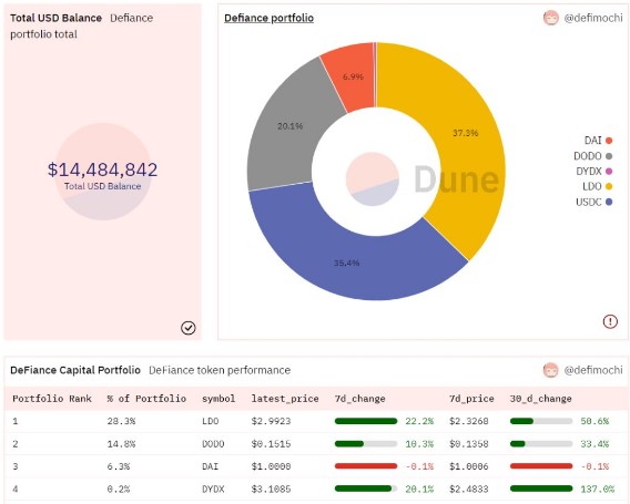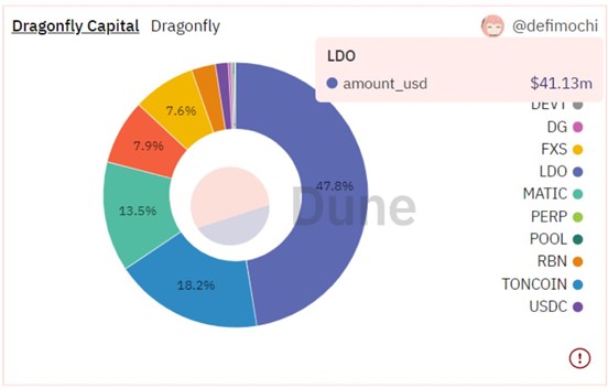 目前能够追踪DeFinance Capital的加密投资组合敞口只有大约1400万美元,虽然数据显示其持有LDO的占比约为28.3%,但据悉该机构应该持有更多LDO。值得一提的是,DeFinance Capital持有量占比第二大的代币是DODO,约为13.8%,过去30天增长了33.4%。