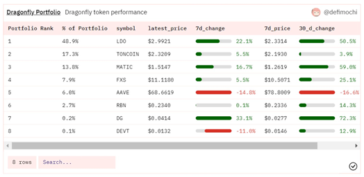 从上图中可以看出,LDO在Dragonfly的投资组合占比高达48%(接近一半),该风投持有占比第二高的加密货币是TON,但表现最好的却是DG(如下图所示,收益率高达72.3%)。分析发现,Dragonfly大部分持有的是以流动性质押衍生品 (Liquid Staking Derivatives ,简称LSD) 为重点的协议代币。