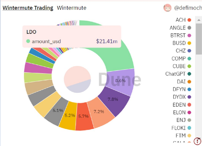 Wintermute似乎也是LDO代币的“超级粉丝”,在其投资组合中LDO的占比已经超过17%,紧随其后的是GALA、DYDX、以及MATIC。截至目前,Wintermute已知投资组合总价值达到了89,408,508美元。