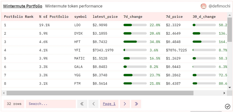 一个有趣的发现是,Wintermute持有大量HFT,占比达到4.6%,在其持有代币中位列第三。需要说明的,Wintermute将持有HFT代币分拆到了两个钱包中,因此下图中的占比数量可能不太准确,粗略估计Wintermute的HFT代币持有占比应该在10%左右,而过去30天HFT的涨幅达到了惊人的154.3%。此外Wintermute投资组合中的DYDX最近表现也相当不错。