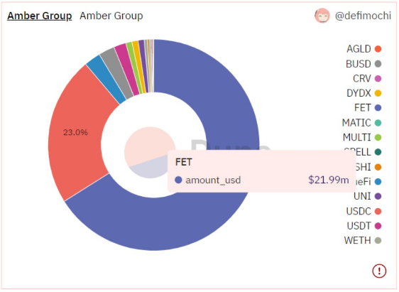 现阶段,链上数据只能追踪Amber Group大约3000万美元的投资组合信息,结果显示该机构最近添加了FET代币,而且数量巨大,目前占到其整体投资组合的近60%(价值约2199万美元)。此外,Amber Group当前依然持有价值约700万美元的稳定币USDC。