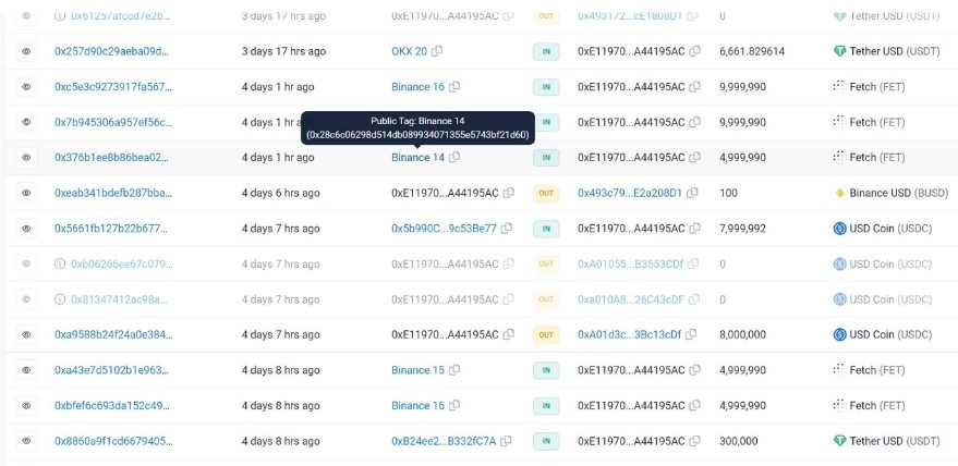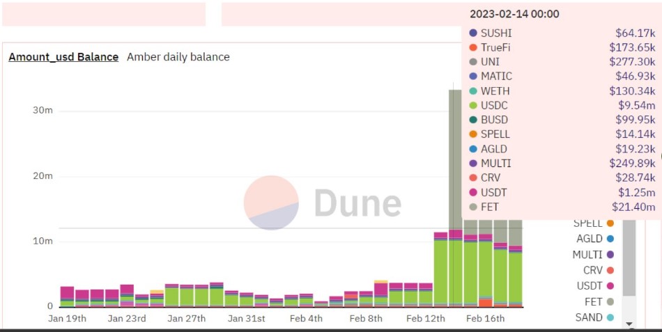 链上数据显示,Amber Group在2月14日从币安交易所将FET转出,这意味着他们很可能提前布局了人工智能风口的项目代币并且在币安平台上购买了FET,然后在热潮褪去并获得收益之后又将这些代币转入自己的链上地址。