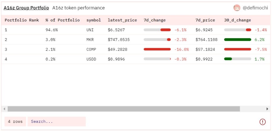 a16z已知的加密投资组合规模超过1亿美元,现阶段达到109,713,485 美元。在这家“老牌”投资机构的加密组合里,持有量最多的是UNI(下跌1.4%)和MKR(仅上涨6.2%),但最近这些代币的表现其实并不尽如人意(对于a16z,真不知道该怎么说好)。