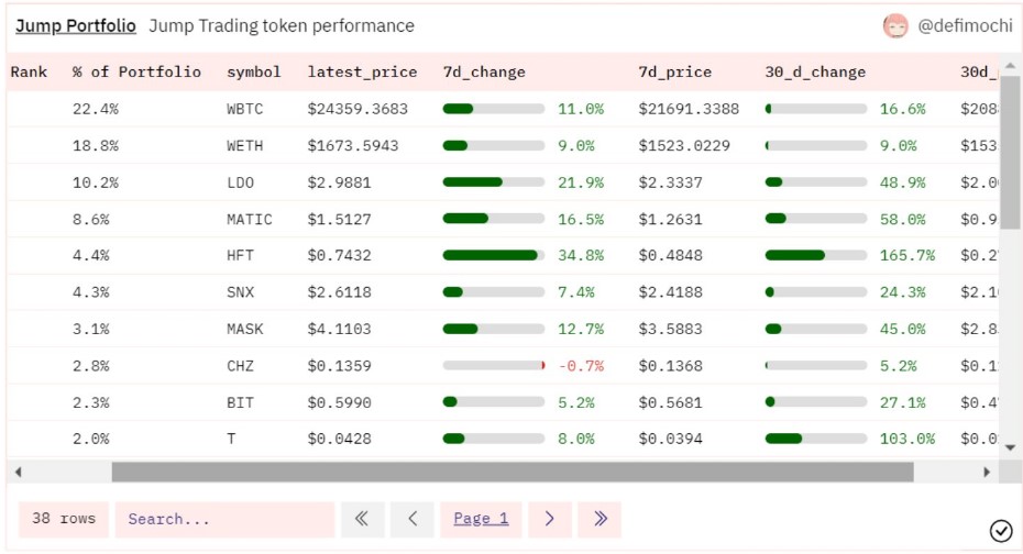 当前Jump Crypto旗下加密投资组合总规模达到148,928,823美元,而且他们的选择也非常好,过去一个月该机构的加密投资价值增长了24%,目前持有量最多的代币分别是WBTC、WETH、LDO和MATIC。