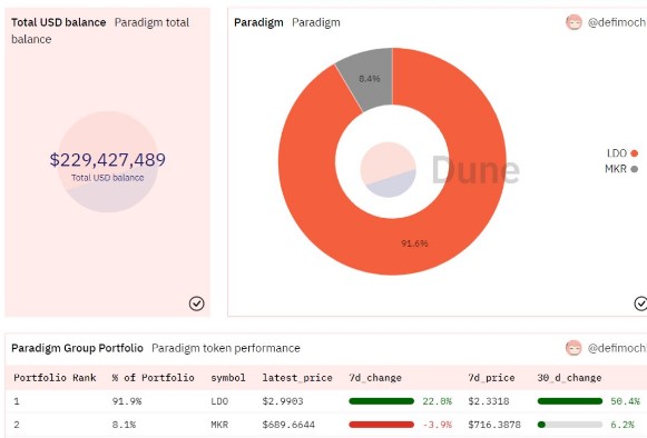 加密/Web3投资公司Paradigm的投资组合非常简单,LDO和MKR,其中LDO占比高达91%。截至目前,Paradigm投资组合余额约为2.2亿美元,过去一个月增长了近40%。去年三月,Paradigm领投了NFT市场Blur 1100万美元的种子轮融资,有消息称其持有BLUR,但目前尚不清楚相关地址信息。