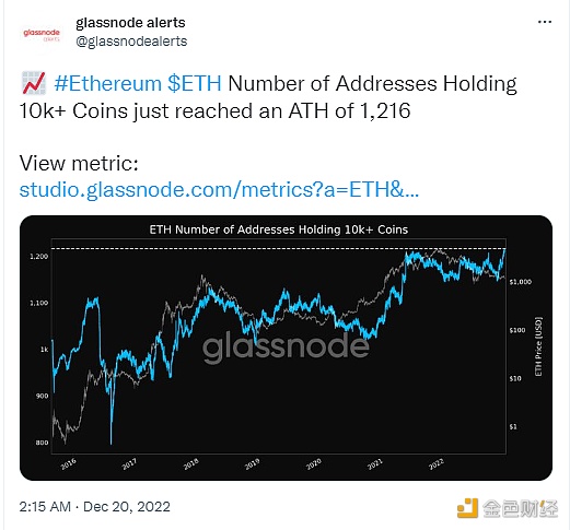 据Glassnodes数据显示,持有超过10000枚ETH的地址数量刚刚达1216个,再次创下历史新高。