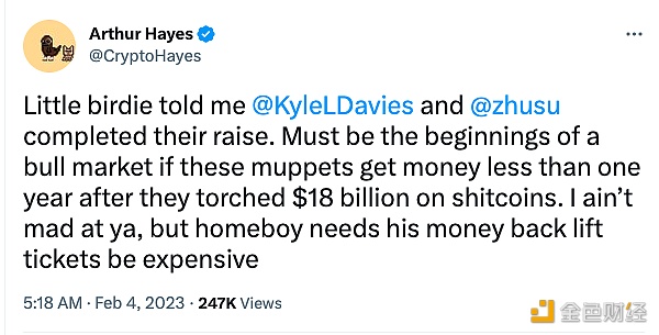 BitMEX创始人Arthur Hayes在社交媒体上发文表示,有消息称,由原三箭资本创始人Su Zhu与Kyle Davies联合2位Coin FLEX联创新建立的CEX项目GTX已完成融资。 据此前市场上流传的GTX融资资料显示,GTX的目标筹集金额为2500万美元,将以债权交易作为市场切入点。