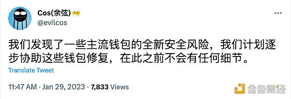 慢雾科技创始人余弦在社交媒体上发文表示,我们发现了一些主流钱包的全新安全风险,我们计划采取措施帮助这些钱包修复,在此之前不会有任何细节。