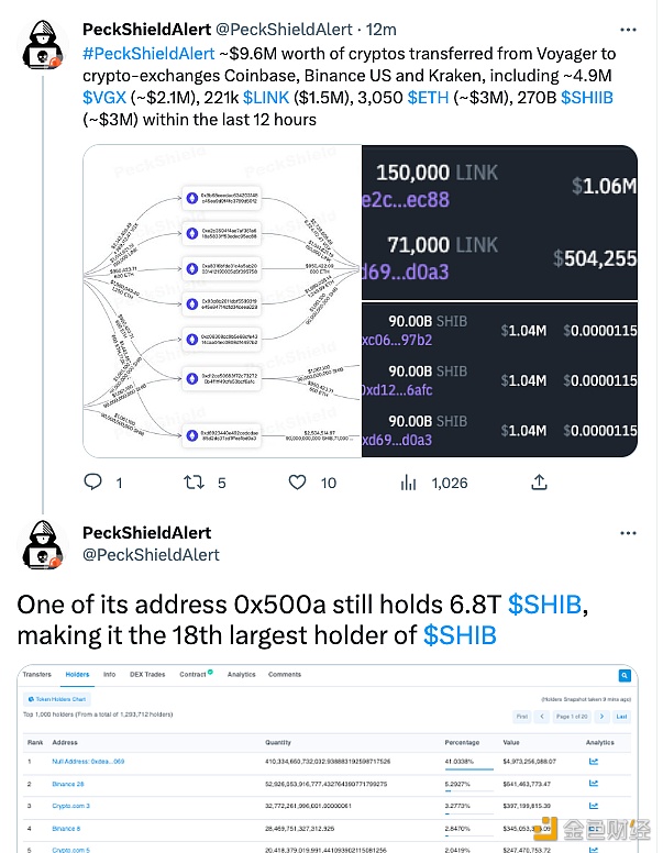 据PeckShield预警监测,在过去12小时内,价值960万美元的加密货币从Voyager转移到加密交易所Coinbase、Binance US和Kraken,包括约490万枚VGX(约210万美元)、22.1万枚LINK(约150万美元)、3,050枚ETH(约500万美元) , 2700亿枚SHIIB (约300万美元)。 此外,Voyager的一个0x500a开头的地址仍然持有约6804746753198.81枚SHIIB,是第18大SHIB持有者。