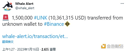 据Whale Alert数据显示,1,500,000 LINK(价值约10,361,315 美元)从未知钱包转移到Binance。