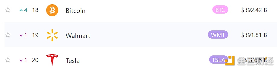 据8marketcap数据显示,随着比特币价格上涨到2万美元上方,其市值已升至3924.2亿美元,超越沃尔玛(当前市值约3918.1亿美元)和特斯拉(当前市值约3865亿美元)。
