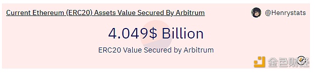 据Dune Analytics数据显示,当前Arbitrum以太坊(ERC20)链上锁定资产价值已突破40亿美元,本文撰写时达到40.40亿美元,累计以太坊(ERC20)链上锁定资产价值为84.15亿美元。截至目前,Arbitrum链上链上合约创建数量为1,960,999个,账户创建总量为443.2万个,其中活跃账户量为366.3万个。