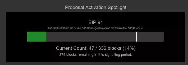 截至记者发稿时,336个街区,其中47个(14%)已经支持BIP 91。(coin.dance/blocks BIP 91投票结果查询网站)