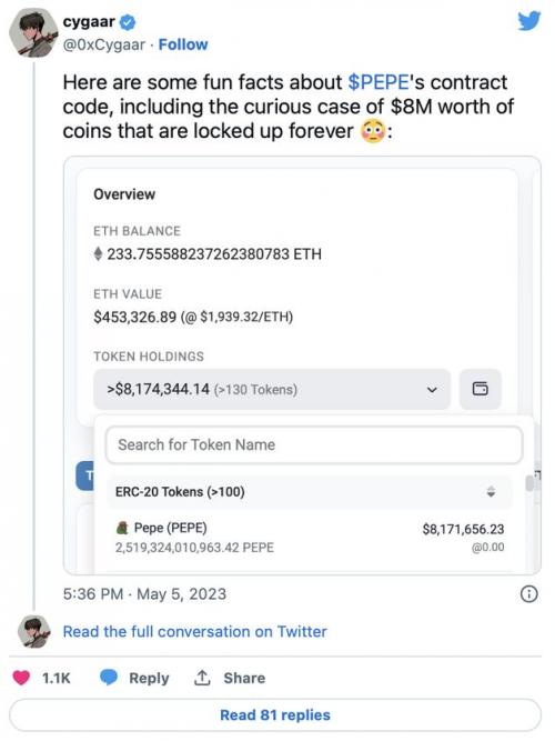 5 月 5 日,Twitter 上的加密货币爱好者 0xCygaar 分享了一些关于 Pepe 智能合约代码的有趣事实,并发现价值近 800 万美元的 PEPE 已被永远锁定。当钱包地址 0xAf2358e98683265cBd3a48509123d390dDf54534 被佩佩的经销商列入黑名单时,这一有趣的发展就发生了。该钱包地址共有 2519324010963 个 PEPE 代币,按当前价格计算价值 800 万美元。此事件中最有趣的细节是,如前所述,代币将永远锁定在钱包地址中。