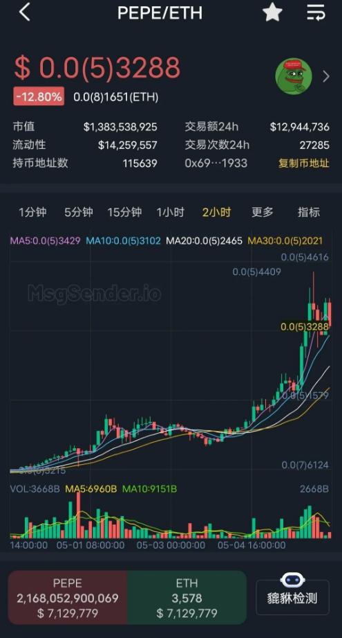 近期的 PEPE 一直在话题热榜上,改变了“不温不火”的市场现状,重新点燃了用户心中靠 Crypto 一夜暴富的梦想。据最新消息,PEPE 24 H 涨幅近 100% ,币价创新高。