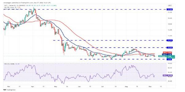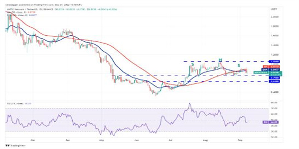 买家试图在 9 月 5 日和 6 日将 Polkadot ( DOT ) 推高至移动平均线上方,但从烛台上的长灯芯可以看出,空头积极捍卫该水平。
