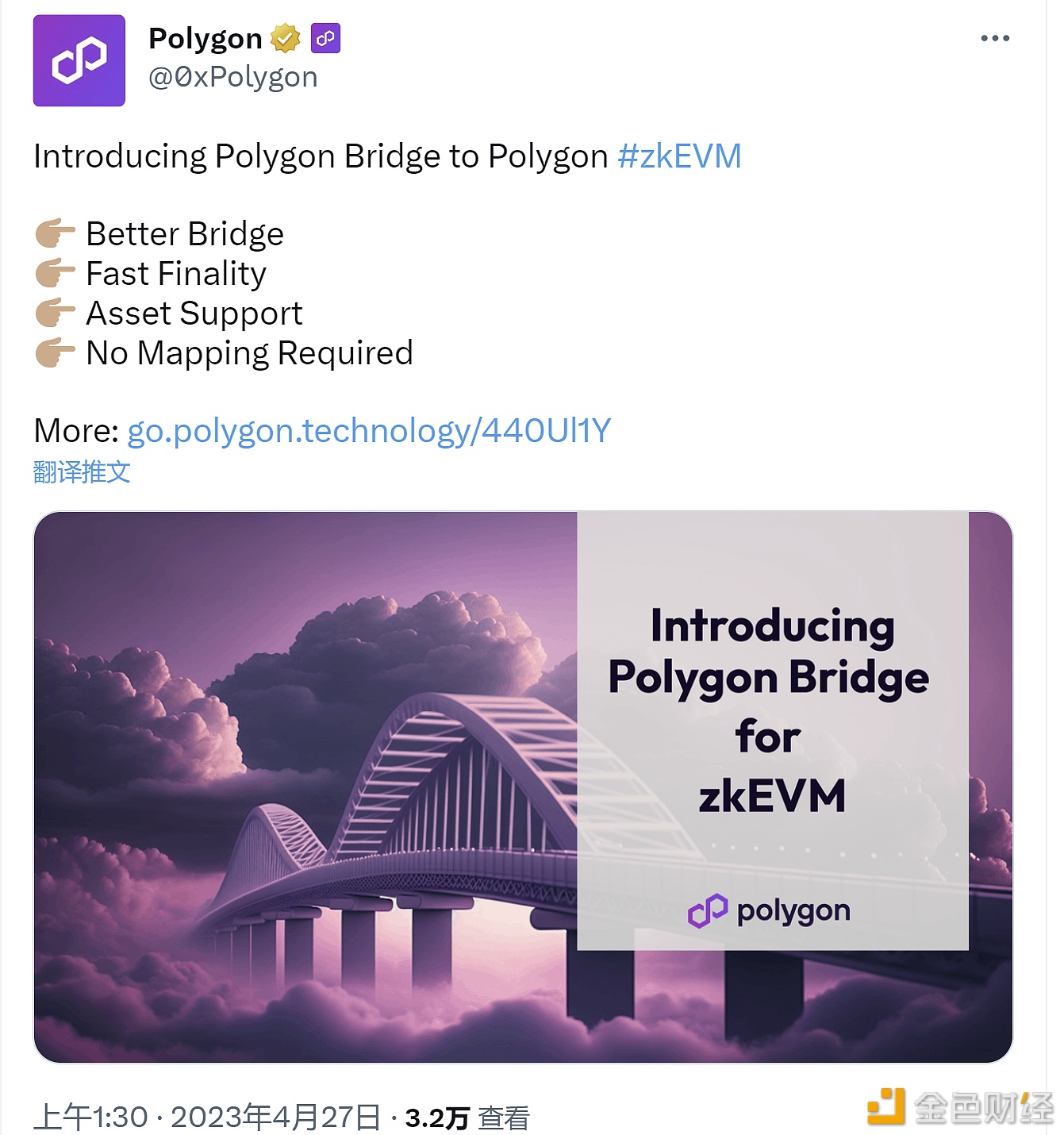Polygon推出Polygon zkEVM跨链桥Polygon Bridge,该跨链桥由零知识技术驱动,由以太坊和Polygon zkEVM上的智能合约管理,支持ERC-20代币和ERC-777代币,用户可在30-60分钟内在以太坊主网上完成资金提取。