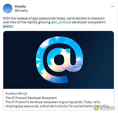 4月23日消息,由 Twitter 资助的去中心化社交项目 Bluesky 宣布发布短期身份验证解决方案 App Password,可让用户试用新客户端,而无需完全信任他们的密码。从长远来看,Bluesky 计划实施具有范围权限的 SSO(单点登录)。Bluesky 核心开发团队目前专注于完成 AT 协议,3 月初,Bluesky 表示,未来几个月优先事项是域名作为用户名和帐户可移植性、可组合的审核和声誉系统、算法选择和自定义 feeds。